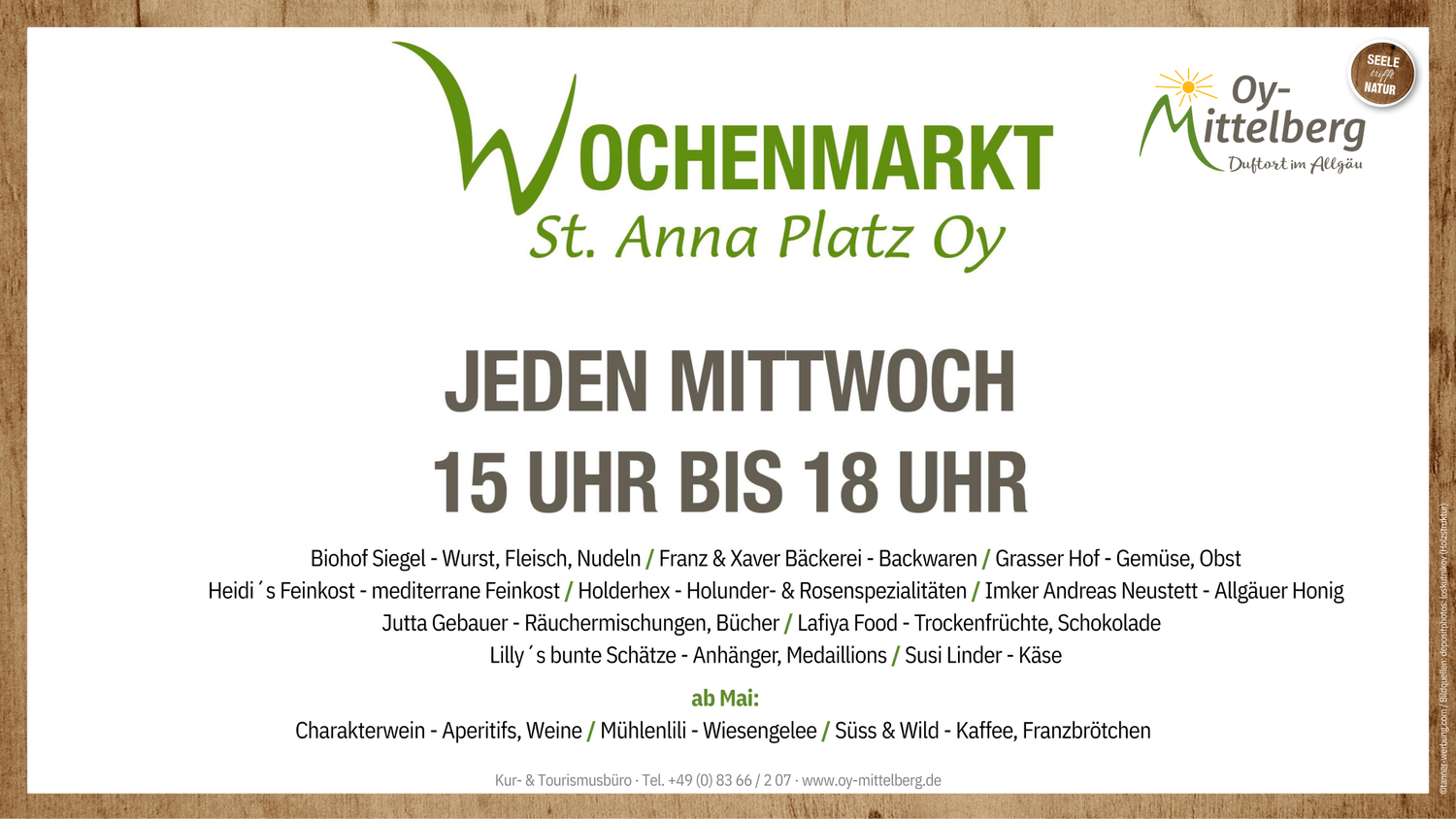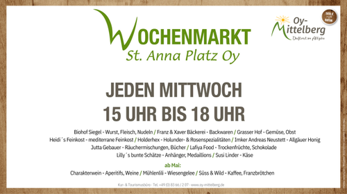 Der Wochenmarkt ist jeden Mittwoch von 15.00 - 18.00 Uhr. Sie finden den Markt auf dem St. Anna Platz und in der Markthalle in Oy.