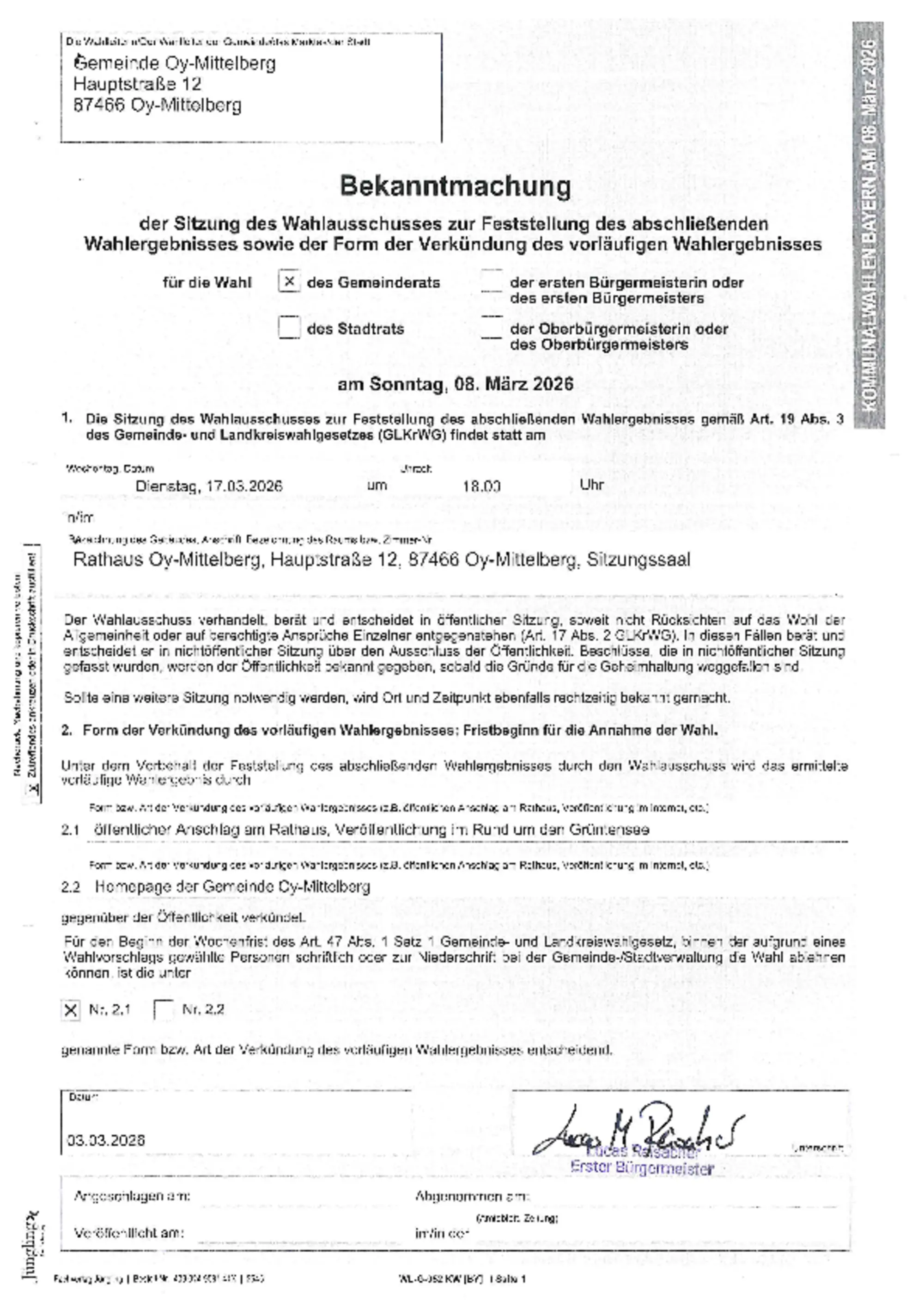 Die Stimmbezirke Oy I und II befinden sich in der Schule in der Haager Straße. In Petersthal erwarten Sie die Wahlhelfer im Vereins- und Gästehaus.