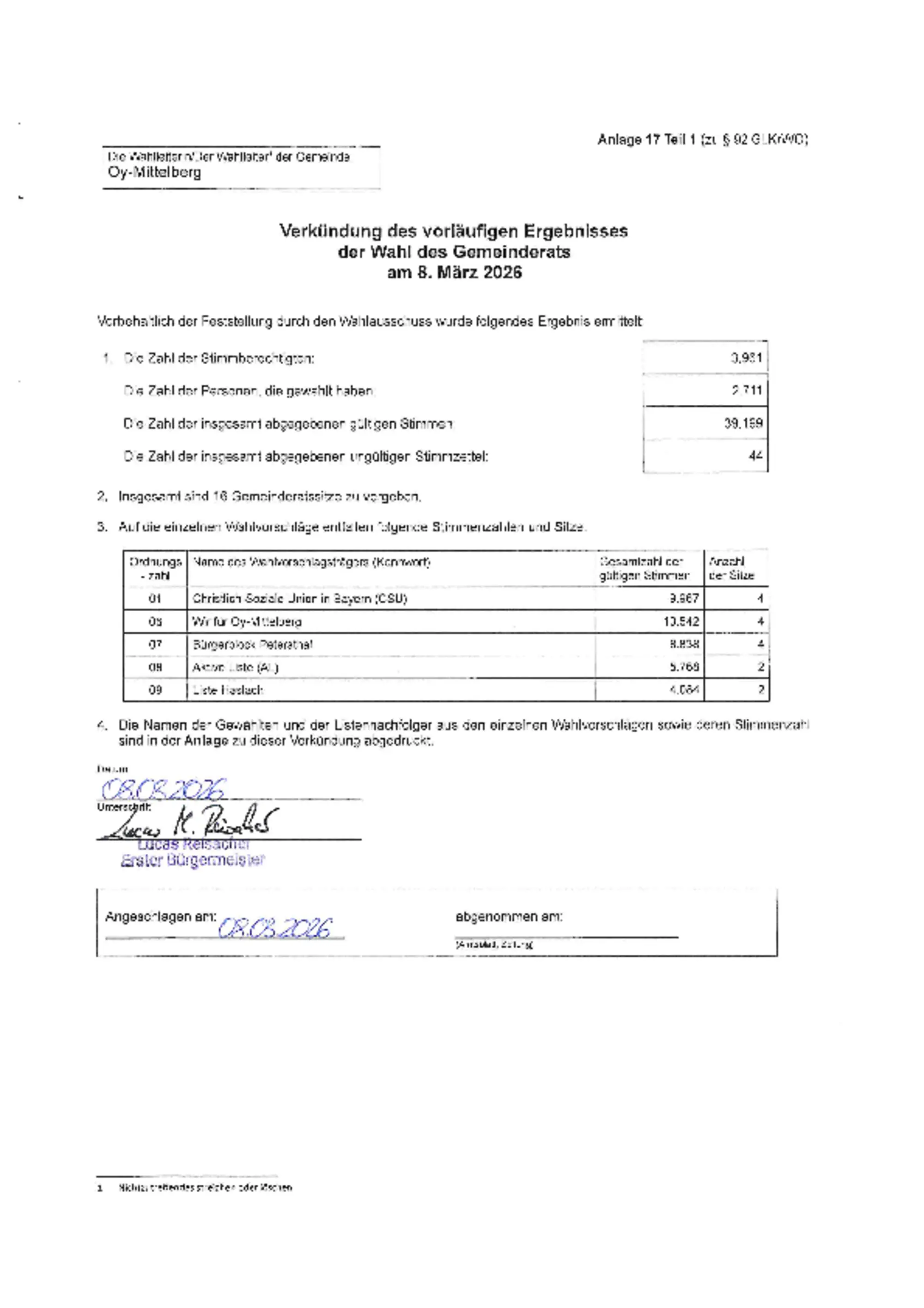 Wahlergebnisse der Gemeinderats-, Kreistags- und Landratswahl