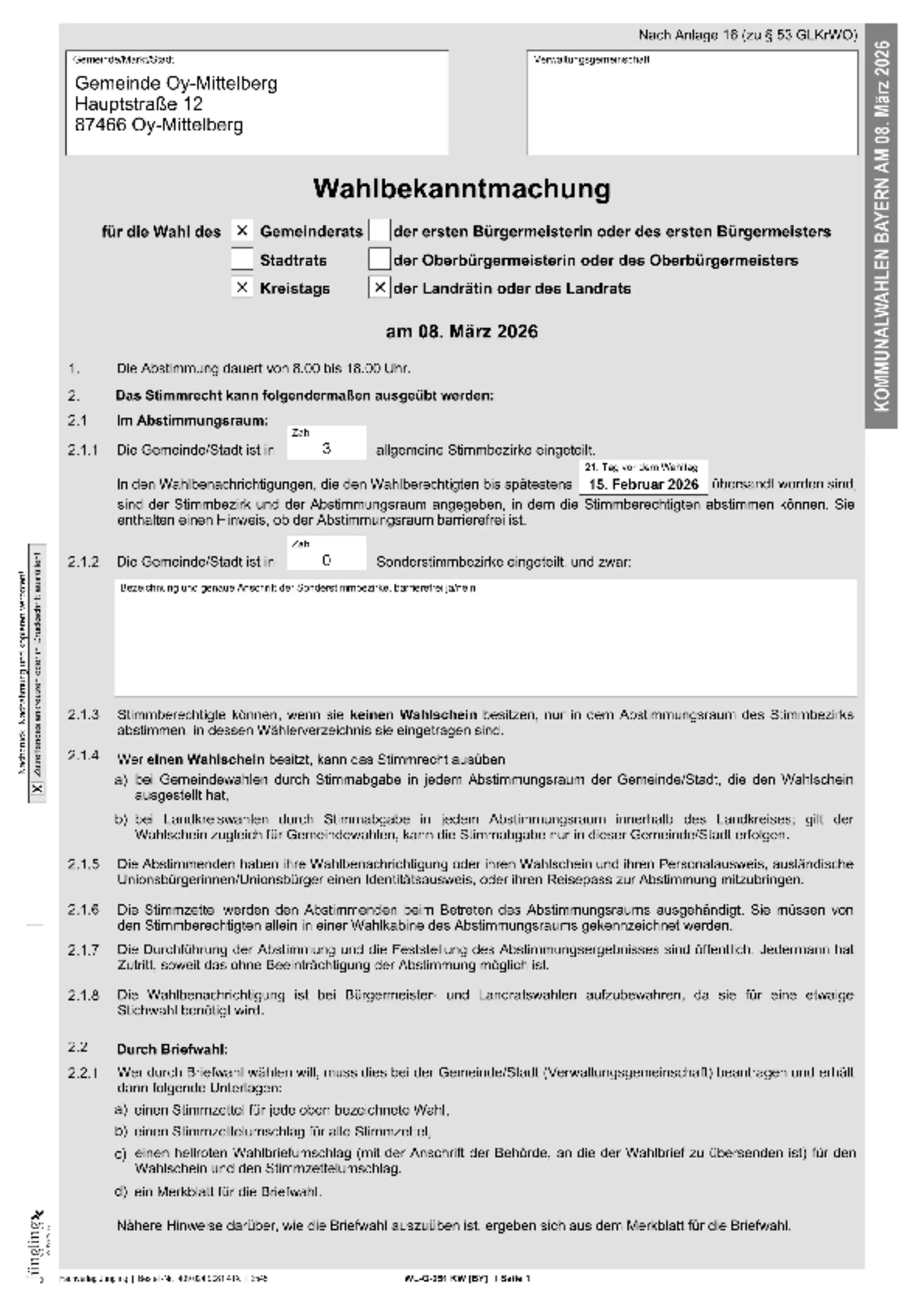 WICHTIG: Wenn Sie bereits Briefwahl beantragt haben, können Sie am Sonntag, 22.03.2026, ohne einen Wahlschein (dieser geht Ihnen mit den Briefwahlunterlagen zu) NICHT im Wahllokal wählen.