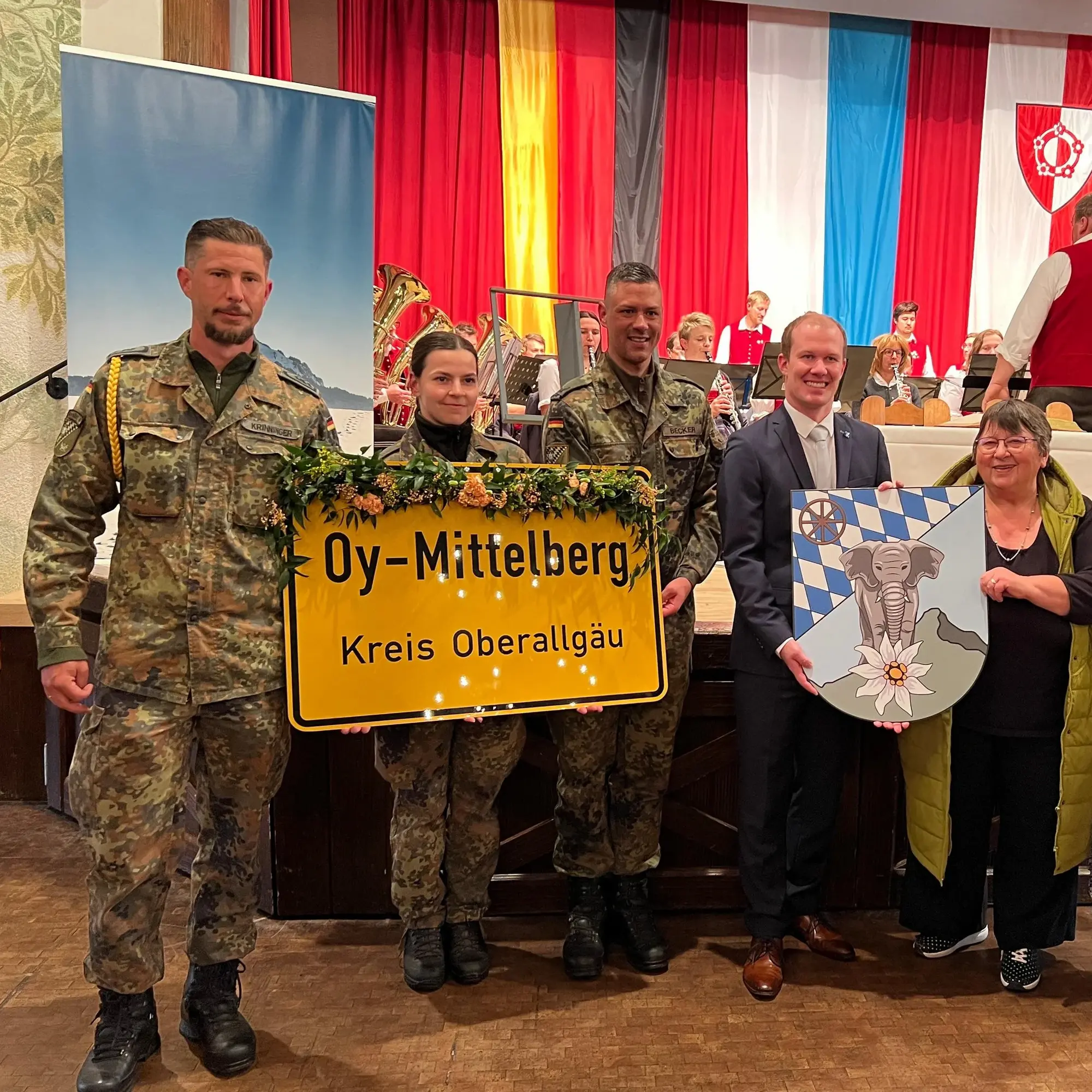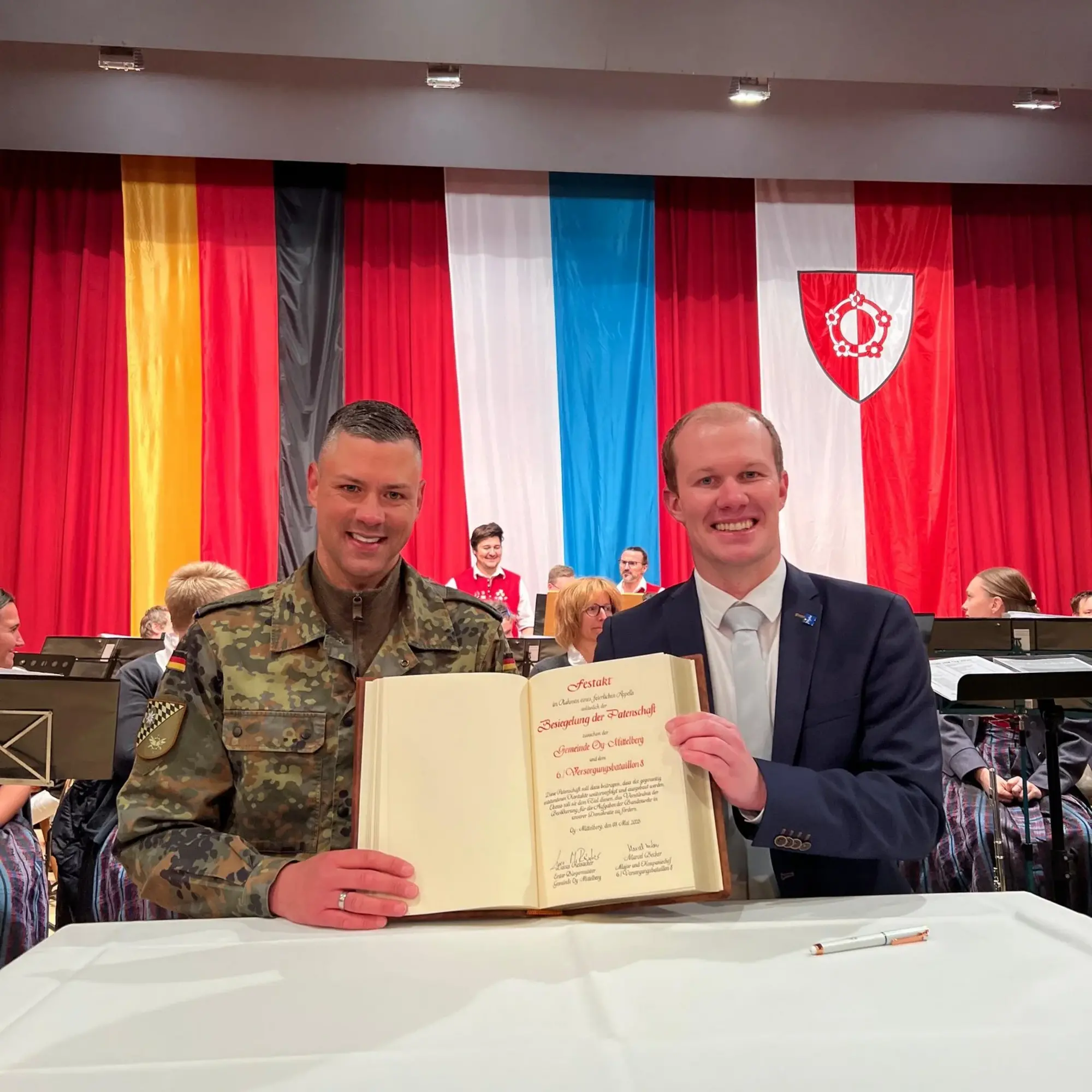 Im Anschluss wurden die offiziellen Urkunden unterschrieben, somit wurde die Patenschaft offiziell besiegelt. Dabei begleitete die Harmoniemusik Oy mit der Bayernhymne und der deutschen Nationalhymne. Mit einem Eintrag in das goldene Buch der Gemeinde wurde die Patenschaft verewigt. Symbolisch überreichte die Kompanie ihr Wappen an die Gemeinde – im Gegenzug erhielt sie ein Ortsschild von Oy-Mittelberg.